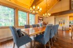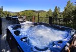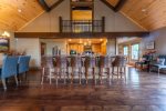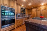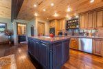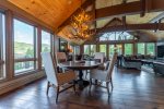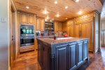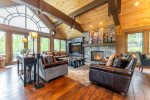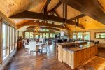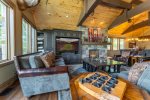 Upstairs the home opens up to the stunning great room. At the heart of the home is the gourmet kitchen,which is perfect for those large family meals. With an open floor plan and vaulted ceilings with handcrafted beams, everyone can be a part of the action. Whether sinking into the custom cowhide lounging chairs, or gathered around the massive rock fireplace, stories are bound to be told and memories made. The dining area will accommodate everyone at the handcrafted table constructed out of a massive cross section of a tree. Step out onto the wrap around porch and grill the perfect steak on the large gas grill. Lounge or dine outside while taking in the expansive views from almost every angle. At night, relax in the new, over sized hot tub and enjoy the endless stars. Back inside on this level there is another junior suite with King bed and en-suite bathroom.