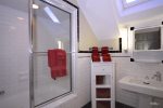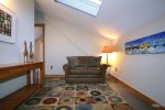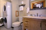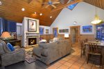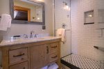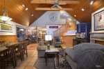 Step inside the home, kick off your shoes, and get ready to relax. The mud room is spacious and inviting with plenty of room for all your outdoor gear including a bike rack! The kitchen is large and open with breakfast seating and plenty of counter space. The 6 burner commercial stove with griddle is great for pancakes and big dinners. Step into the great room with soaring ceilings. The dining room is located in the great room and has an inviting reclaimed table and chairs that are definitely unique. On this level is a bedroom with a King bed and full bath done in period style black and white subway tile. Down the hall you will find the bunk room with two sets of custom log bunks and a great laundry area should you decide to do some chores while on vacation.