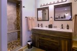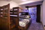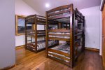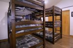 Looking for a place to let the kids have their own space? There is an attached apartment over the garage that is the size of a whole house. This space is accessed by an outside stairwell beside the garage and has a large living room with vaulted ceilings, a fully equipped kitchen with island, along with a dining area, and two bedrooms each with a full bath. One of the bathrooms is in the living area and the other is a jack and jill bath with a vanity in each bedroom and a connecting bath area with large shower and two toilets. The two bedrooms are set up to be bunk room heaven for kids! One bedroom has a set of bunks with double beds on top and bottom along with another set of twin bunks. The second bedroom has 2 sets of triple bunks with 3 twins apiece. The large living area has comfy leather couches and a large tv for the perfect kid space. So if you are looking for the perfect spot for your large family or group of 20 then make plans to stay at Legacy Lodge today!