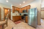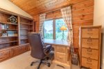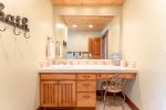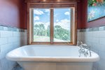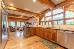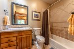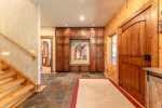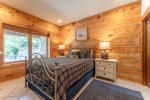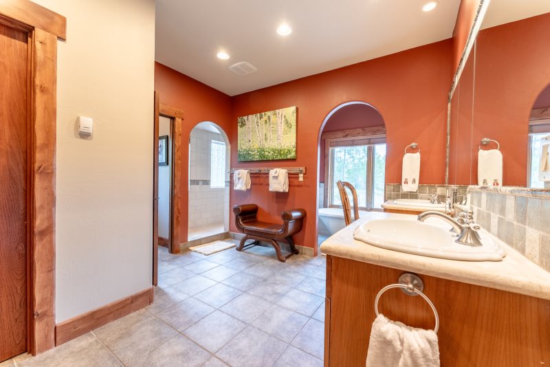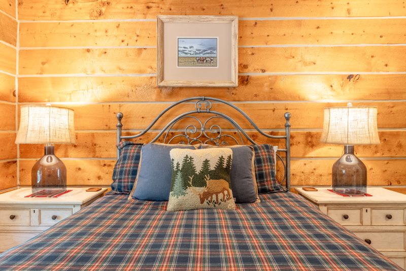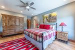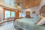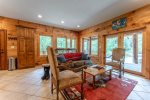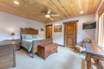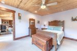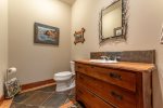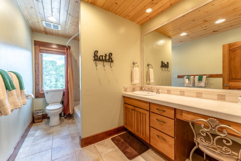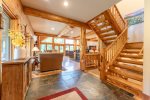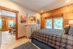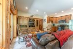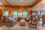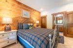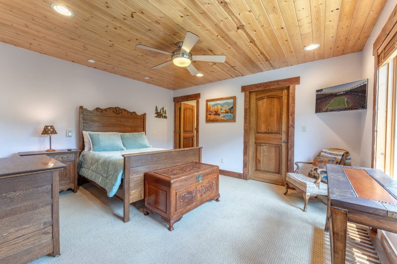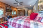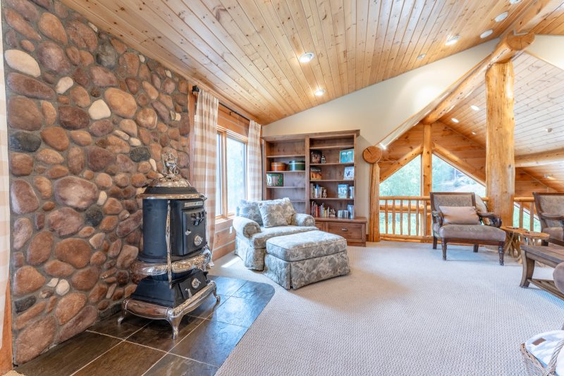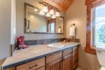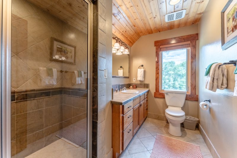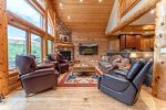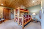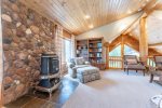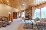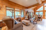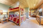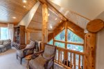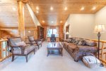Past the front entrance is the sumptuous master retreat with King bed, rocked gas stove fireplace, smart tv and views of the river. The en-suite master bath is huge and has dual vanities, an oversized shower, water closet, and a beautiful oversized soaking tub. Upstairs you will find a large secondary living area with vaulted ceilings, plenty of comfy seating and a pull out sleeper sofa. There is a small library of childrens books and games along with a dedicated desk and work area. This level also has two guest bedrooms with en-suite baths for each. One bedroom consists of bunk beds that are a queen bed on bottom and twin bed on top. There is a smart tv in this room and the en-suite bath has a walk in shower. The bedroom on the other side of the loft living area has a queen bed, smart tv, and the en-suite bath has a shower/tub combo.
